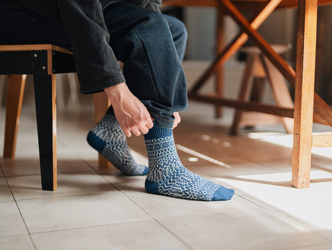 縮みにくく柔らかいのが特徴的な防縮ウールを使用したウールジャガードソックスです。ふくらみのある防縮ウールをしっかりと編み上げているので、どっしりとした履き心地で、とても温く仕上がっています。洗濯を重ねても、縮みにくい設計なので、寒い冬場に、繰り返し履いていただけます。