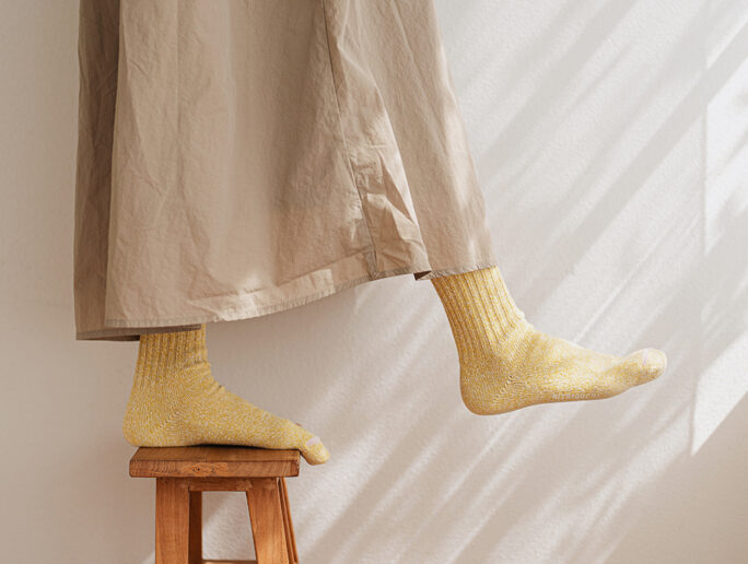 エコシルクとリサイクルコットンを撚り合わせた糸で作られています。シルクとコットンは染色液が異なるため、2回に分けて染めているのもこだわりのポイントです。その際の微妙な色の違いが、綺麗さとカジュアルな質感の両方を生み出しています。シルクは吸収性と放湿性も高く、汗をかきやすい夏場にもぴったりです。春夏をメインとした薄手の靴下として販売を開始しましたが、結果的には1年中人気の商品となっています。