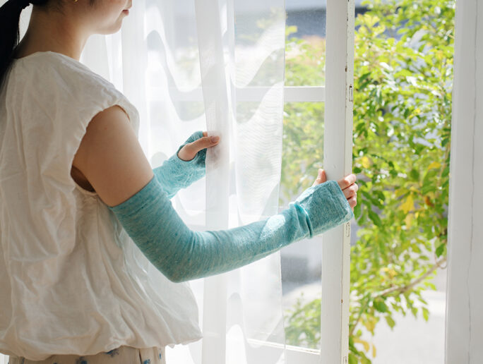 シャリシャリとした清涼感、熱を伝えにくい特徴があるリネンをメッシュ編みにしたアームカバーです。リネンは熱伝導率が低く、生地が体の熱で温まりにくいので、夏でも清涼感のある付け心地をキープしてくれます。腕部分をメッシュ編みにすることで通気性が高くなり、歩くたびに空気が入れ替わり熱くなりにくいのがポイント。中には、何も着けずに直射日光が当たるより、着けている方が涼しいと感じる人も多数いらっしゃいます。メッシュ編みですが、UVカット率は90~97%と高くなっていて、日焼けが気になる女性も安心してお使いいただけます。