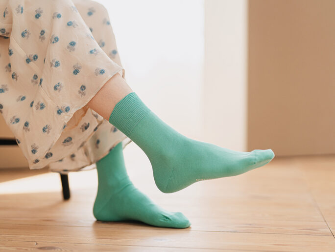 エジプト原産のとても長いコットンのギザコットンを使用しています。柔らかく光沢のあるギザコットンを甘く撚うことで、さらに柔らかさが出てきています。ハンドリンキングという手法を採用しているため、つま先がゴロゴロしないので、ストレスなく履いていただけます。薄手で、どんな靴やファッションにも合わせやすく、プレーンな靴下です。