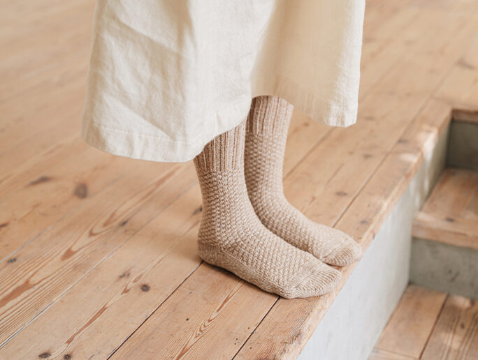 ウールの洋服を糸に戻したリサイクルウールと落ち綿のヴァージンコットンのリサイクルコットンをブレンドした環境にやさしい厚手のウールソックス。ウールらしいボリュームに加え、通常のウールより丈夫なので、アウトドア、キャンプ、トレッキングなどのブーツにぴったり。