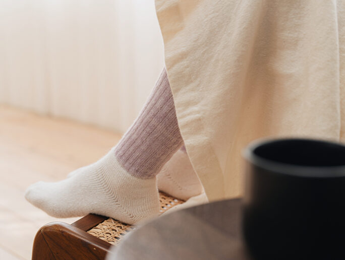 生後1年以内の柔らかなキッドモヘアとウールをブレンドした起毛糸を使用しています。キッドモヘアは柔らかで保温性が高いのが特徴で、ウールとブレンドすることにより、薄手でも温かな靴下に仕上がりました。足の部分をパイル、足首は二重に編まれたレッグウォーマーになっていて、寒さが厳しい雪国でも、足元から温かく過ごしていただけます。